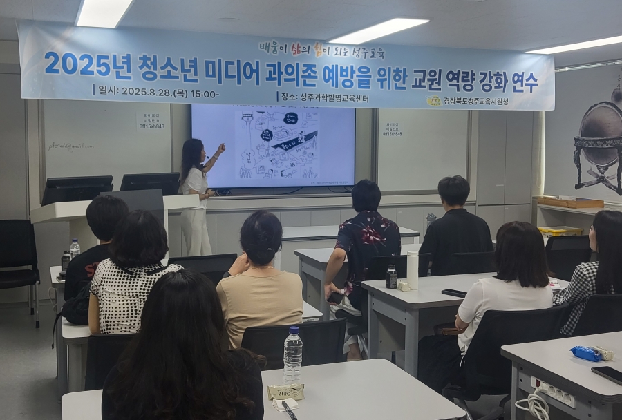 성주교육지원청(교육장 정수권)은 지난 28일 관내 초‧중‧고등학교 교원 25명을 대상으로 성주발명교육센터 창의실에서 2025년 청소년 미디어 과의존 예방을 위한 교원 역량강화 연수를 실시했다. 이번 연수는 디지털 환경에서 청소년의 미디어(스마트폰, 게임, SNS 등) 사용이 증가함에 따라 발생하는 과의존 문제를 예방하고, 교사의 지도 역량을 높이기 위해 마련됐다. 연수에 참여한 교사는 “학생들의 스마트폰 사용에 대해 막연한 걱정만 하고 있었는데, 구체적인 예방교육 방안을 알게 되어 교육자로서의 역할을 다시 고민하게 됐다”고 소감을 밝혔다. 정수권 교육장은 “이번 연수를 통해 교사들이 청소년 미디어 과의존 문제를 보다 전문적으로 이해하고 예방할 수 있는 기반을 마련하게 됐다”며, “앞으로도 지속적인 연수와 자료 개발을 통해 학교 현장을 적극 지원할 계획이다”고 밝혔다.