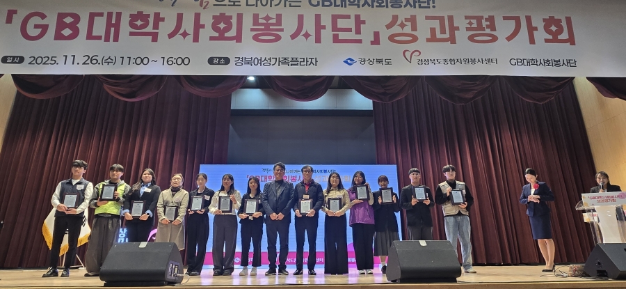 경북도는 지난 26일 경북여성가족플라자에서 ‘2025 GB(경북)대학사회봉사단 성과평가회’를 열고, 2025년 한 해 동안의 지역사회 곳곳에서 자원봉사로 활약한 GB대학사회봉사단의 성과를 공유하는 시간을 가졌다.