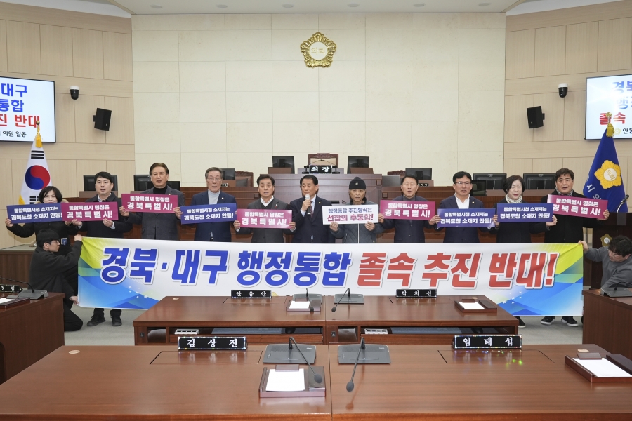 안동시의회(의장 김경도)가 지난 27일 본회의장에서 경상북도와 대구광역시가 발표한 ‘행정통합 중단 없는 추진 합의’에 대해 강력한 유감을 표명하며, 경북 북부권의 진정한 균형발전 대책이 선행되지 않은 행정통합에 대해 결사반대한다는 성명서를 발표했다. 안동시의회는 성명서를 통해 이번 통합 논의를 대의민주주의 가치를 훼손한 ‘절차적 위헌성’으로 규정했다. “시·도민의 충분한 공감대 형성이 선행되지 않은 일방적 추진은 결코 정당성을 얻을 수 없다”고 지적했다. 특히 “국토 균형발전의 상징인 경북도청 신도시의 미완성 상태에서 추진되는 행정통합은 경북 북부권의 생존권을 위협하고 지역 불균형을 심화시키는 자멸적 선택이 될 것이다”고 우려를 표했다. 또한 경북·대구 행정통합이 실질적인 지역 성장의 해법이 되기 위해 반드시 선행되어야 할 ‘5대 원칙과 조건’을 다음과 같이 천명했다. 첫째, ‘선(先) 통합, 후(後) 조율’이라는 기만적인 추진 방식을 규탄하며, 충분한 공론화와 사회적 합의 없는 통합 시도를 결코 용납하지 않겠다는 입장을 명확히 했다. 둘째, 국토균형발전이라는 도청 이전의 본래 목적을 사수하기 위해 통합특별시 청사 소재지를 현 경북도청으로 법률에 명확히 명시할 것을 강력히 요구했다. 셋째, 도청 신도시 조기 완성, 북부권 국가산업단지 조성, 핵심 공공기관 이전 등 북부지역 생존을 위한 실질적 대책이 선행되지 않는 한 통합 논의는 무의미하다고 천명했다. 넷째, 중앙정부로부터 이양되는 권한과 재원이 기초자치단체로 실질적으로 배분되어, 북부지역의 자치권과 재정 자율권이 확실히 보장될 것을 엄중히 요구했다. 다섯째, 임기응변식 특별법 제정에 반대하며, 지역 균형발전을 담보할 상시적이고 강력한 제도적 장치 마련 없이는 행정통합을 인정할 수 없다는 입장을 분명히 했다. 김경도 안동시의회 의장은 “정부의 재정 지원 약속이 실질적인 실행 계획 없이 선언적 수준에 머문다면, 통합은 결국‘대구 중심’으로 치우쳐 지역 불균형을 심화시킬 것이다”며, “안동시의회는 시민의 뜻에 따라 지역의 미래를 위협하는 졸속 통합 추진에 맞서 흔들림 없이 나아갈 것이다”고 강조했다.