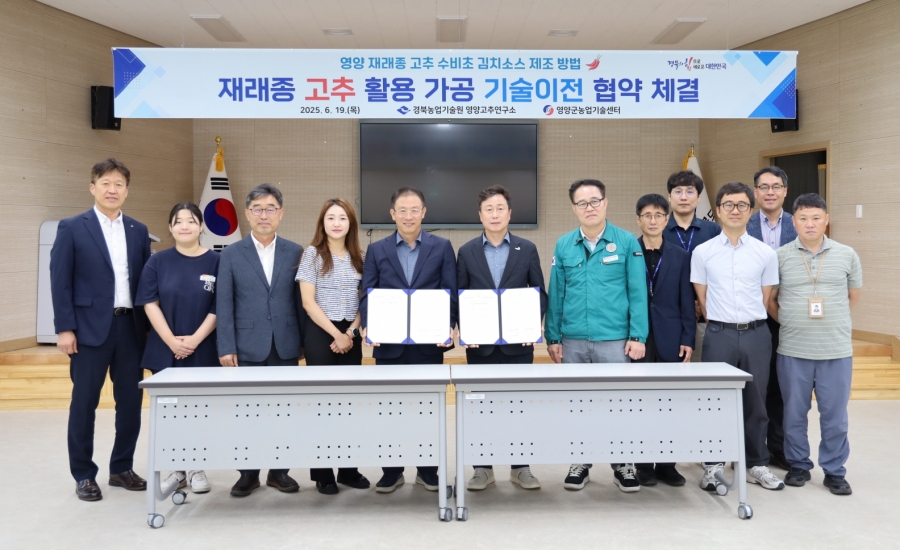 경북농업기술원이 지난 19일 영양고추연구소와 경북전문대학교가 공동으로 개발한 영양지역 재래종 고추 ‘수비초’를 활용한 ‘수비초 김치소스 제조기술’을 영양군농업기술센터에 이전했다. 이번 기술이전은 영양지역 고유 품종인 수비초를 활용한 새로운 소득 창출 방안을 마련하고, 지역 농산물 가공기반을 갖춘 영양군농업기술센터를 통해 김치소스 제품의 상용화와 판매 활성화를 촉진하기 위해 추진됐다. 이전 대상 기술은 수비초 고춧가루를 사용해 만든 김치즙을 핵심 원료로 활용한 발효 기반 ‘기능성 김치소스’ 제조기술로 침치소스는 발효 풍미는 물론 건강 기능성까지 갖춘 새로운 유형의 양념소스로 전통 발효식품과 지역 특산물을 융합한 고부가가치 제품으로 평가받고 있으며, 건강지향 식문화에 부합하고 영양지역 고추자원의 우수성을 결합한 스토리텔링 마케팅이 가능해 지역 브랜드화와 부가가치 제고에 크게 기여할 것으로 보인다. 또한, 주재료인 수비초는 감칠맛을 내는 아미노산인 아스파르트산과 글루탐산 함량이 일반 고추보다 각각 1.4배, 2배 높고, 항산화 및 항당뇨 활성도 각각 1.8배, 1.4배 뛰어난 것으로 나타나 맛과 건강을 겸비한 영양지역 대표 재래종이다. 기술을 이전받은 영양군농업기술센터는 농산물가공지원센터를 운영하며, 가공제품 생산 장비와 시제품 제작 인프라를 활용해 농가 교육과 제품화를 지원하고 있으며, 이번 기술이전으로 창업 활성화와 지역 고추 소비 확대 등 실질적인 경제 효과가 기대된다. 조영숙 농업기술원장은 “이번 기술이전은 영양 고유 품종인 수비초의 우수성을 재조명하고, 이를 지역 농산물 가공기술과 연계함으로써 고추 산업의 새로운 활로를 여는 계기가 될 것이다”며, “영양군농업기술센터와의 협력을 통해 수비초 김치소스가 지역을 대표하는 고부가가치 가공품으로 자리매김하길 기대한다”고 밝혔다.