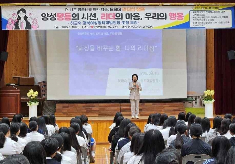 업무협약 체결 직후에는 전교생을 대상으로 ‘더 나은 공동체를 위한 약속, ESG 리더십 캠프’가 이어졌다. 첫 순서로 진행된 하금숙 경북여성정책개발원 원장의 특강에서는 1~3학년 전체 학생들이 참여해 차세 대 여성 리더로서 갖추어야 할 역량과 양성평등의 중요성에 대해 들었 다.